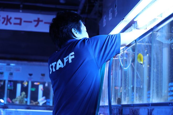 いつもこんなに水槽がきれいなのは、スタッフのみなさんのおかげ。スタッフは男子だけでなく女子スタッフも結構います。専門学出身者ではなく、四年制大学出身者がほとんどだそうです。