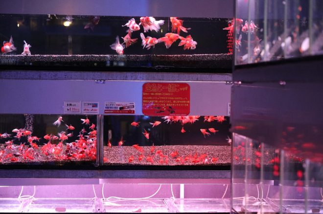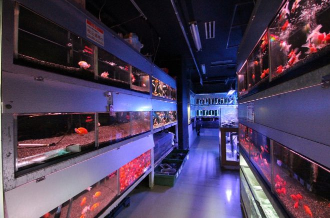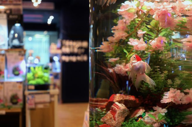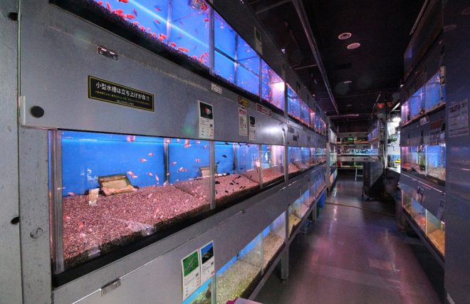 このあたりは金魚ゾーン。水槽の透明度もクリアで美しい。住環境がいいからでしょう、生体たちもとっても元気です。