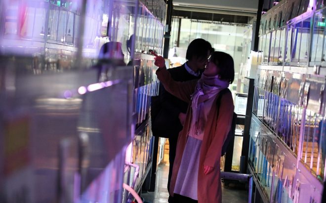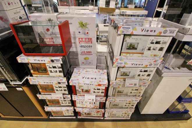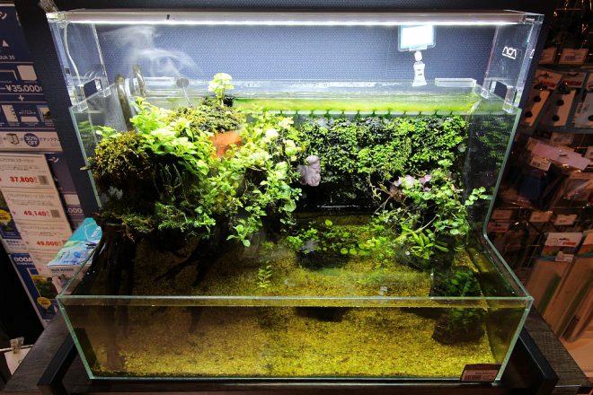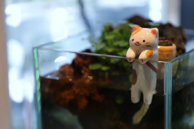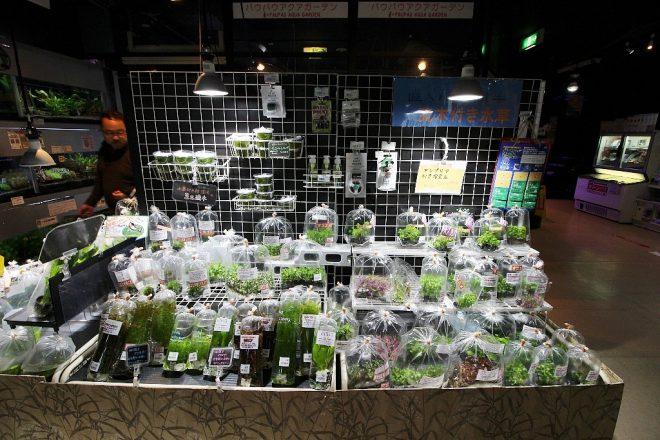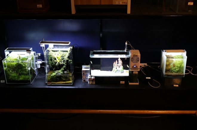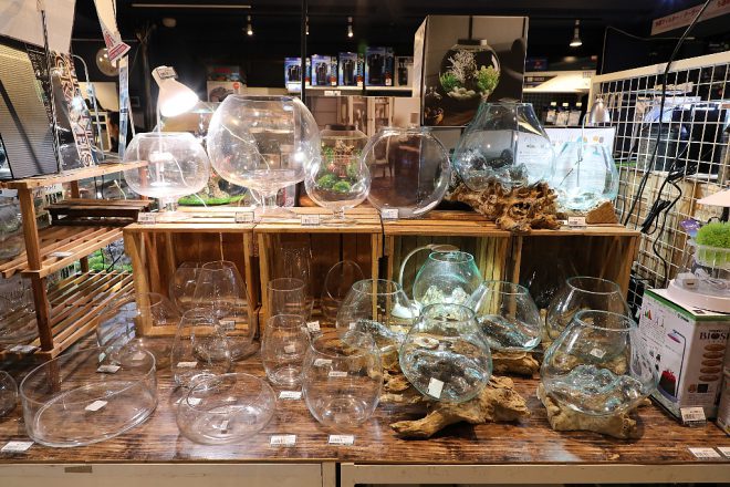ワンポイントでテラリウムやコンパクト水槽があったりで、パッケージばかりが並ぶシチュエーションにあって、ひとときの潤いを醸し出しています。