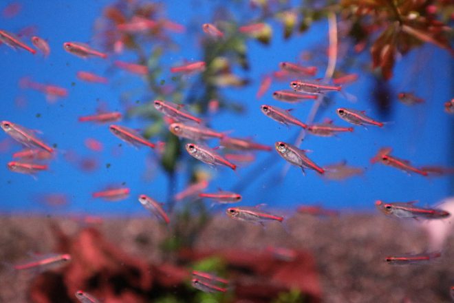 体長5センチほどのネオンドワーフレインボー。メタリックブルーの発色がキラキラと美しいのが印象的です。