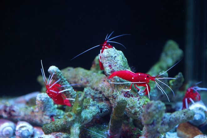 おお~、こんなシュリンプみたことない(笑)。真っ赤なボディと、足やヒゲ先のホワイトがきれいな海水性エビの花形・ホワイトソックス。単にきれいなだけではなく、寄生虫を掃除するクリーナーシュリンプとしても知られています。アクア女子が喜びそうな生体です。
