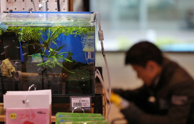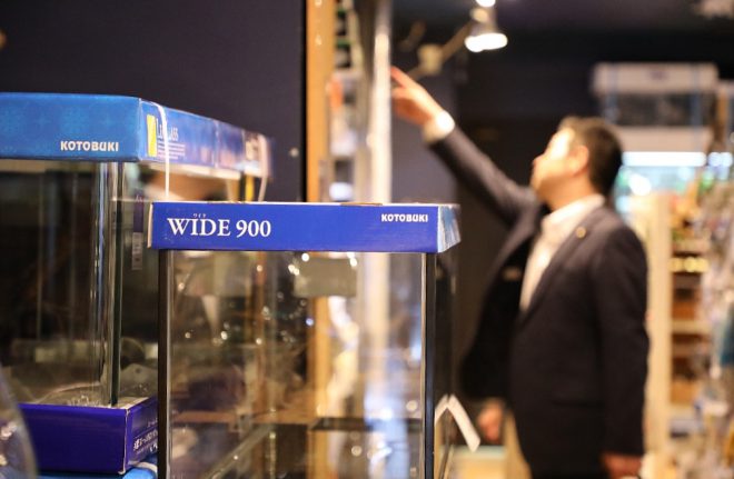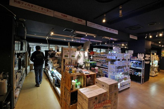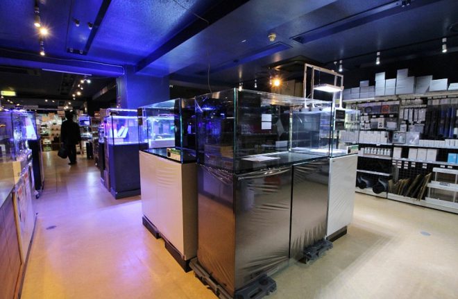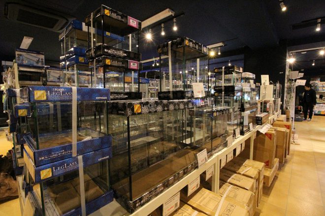 水槽の動向でいえば、最近はやっぱり小型水槽が中心。この波は関東でも同じでした。「KOTOBUKIの15センチのシリーズは特によく売れます」。なるほど、首都圏だからといって大型水槽が売れるわけではないんですね。
