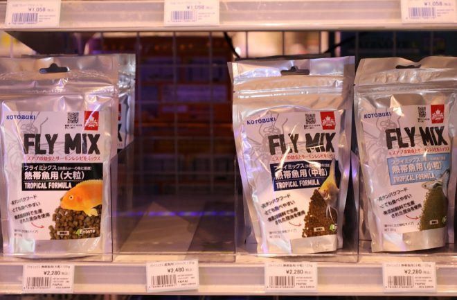 「FLY MIX」のコーナーを覗くと、熱帯魚用のところだけ商品がありませんでした。副店長!すぐに補充を(笑)!コリドラス用に買っていくお客さんが結構多いのだそうです。「最初はどうなることかと思いましたが、ほかのエサより高価でプレミアム感は満載(笑)。その分内容的な差別化もできていると思うので、これからの動向は大いに注目すべきでしょうね」。