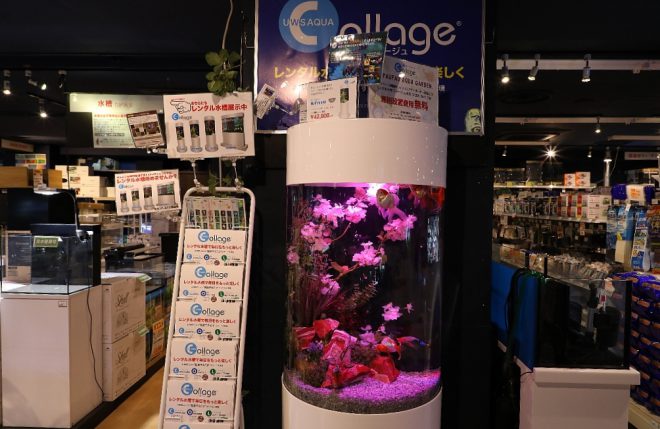 こちらはイチオシのレンタル水槽。近隣のオフィスのほか、銀座のクラブなどからの引き合いもあるのだそう。レンタル水槽だけでなく、アクアをサポートすべくメンテの請負も行っています。