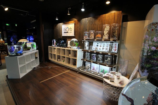 何やらインテリアチックなラウンドフォルムの水槽が。ああ、これはインターペットでも出展されていた「biOrb (バイオーブ)」のブランドで知られるOASEジャパンさんですね。エントランスを入ってすぐのところにある、いわば店内の一等地。ショールーム的なこのスペースだと、きっと販促効果も上々でしょう。