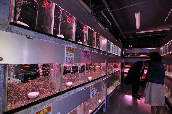 聞いてみると結構多かったです。バラエティーなどでおなじみのタレントさんは、少なくとも1週間に1度はご来店。「メダカや金魚を飼育されていることは有名ですから」。なるほど。真打ち以上のベテラン噺家さんも時々。「えーっと、名前は忘れました(笑)」。ドラマにもよく出演している若手男優さんが、奥様と小さいお子様を連れてやってくることも。それに、「あのアイドル事務所に所属の大物タレントもお越しになりますよ。それも何人も」。へー、そんなにたくさん?YOUもぜひ行かなきゃ(笑)。また、新橋演舞場が近いことから、あの歌舞伎役者さんもやってきます。しかも120センチや150センチといった大型水槽をお持ち帰り。