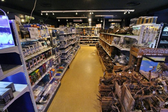 アクア用品が揃う2階にワープ。通路幅も広くゆったりしています。これなら日祝日に多くの来店客があっても、お互いが遠慮して気を使いながら商品を品定めしないといけないこともなさそうです。まるで外資系の大型ショッピングモールのよう。どのコーナーへ足を運んでもごちゃごちゃ感がないのは、やっぱり関東テイストだから(笑)?