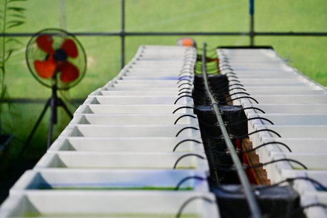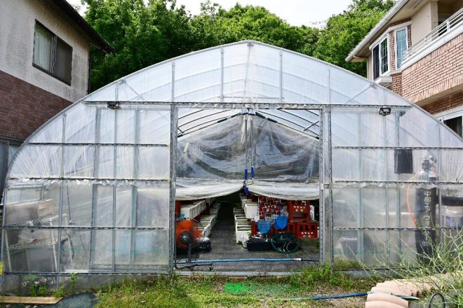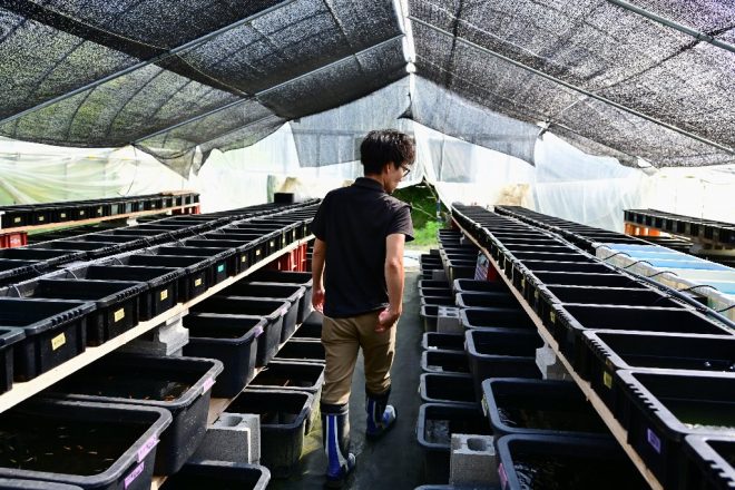 ビニールハウスの主は高槻市出身の野口賢次さん。10年以上ショップ勤めを経験し、3年前にメダカの生産者として業界デビュー。現在は、ホームセンターなどのインショップにメダカを卸しています。顧客数は何と100超えというから驚きです。