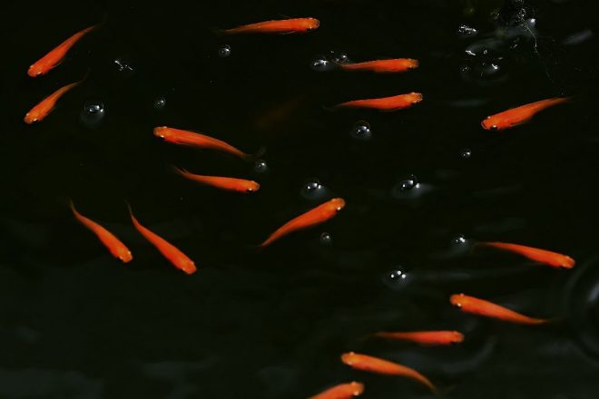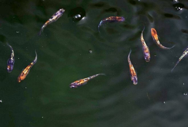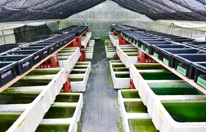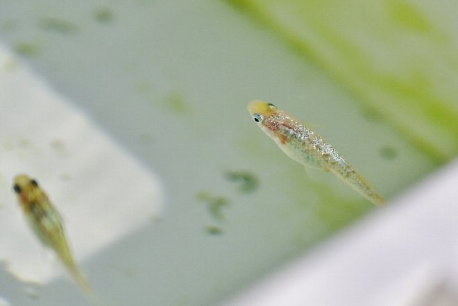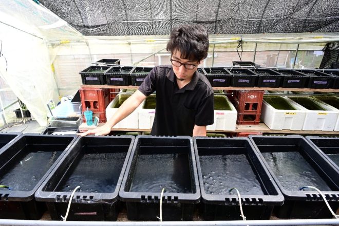 エサであるはずのミジンコが、これから成長しようとする針子と混泳?「今の針子のサイズだと体が小さく、ミジンコが大きすぎて食べられないんです。針子が成長してミジンコが食べられるようになる頃にはミジンコももっと増えているので好都合なんです(笑)」。
