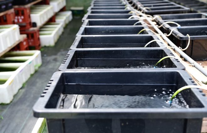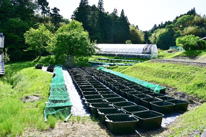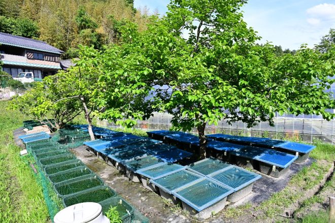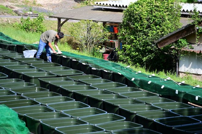 孵化した針子は、一段下の容器に移動するだけで済む野口さん独自のシステマチックな方法。この方法であれば、産卵床や針子の移動が最小限で済みます。結果的に作業に無駄がなく効率的。そして、親魚・卵・針子が一括で管理できるというのが、何よりの利点といえるでしょう。