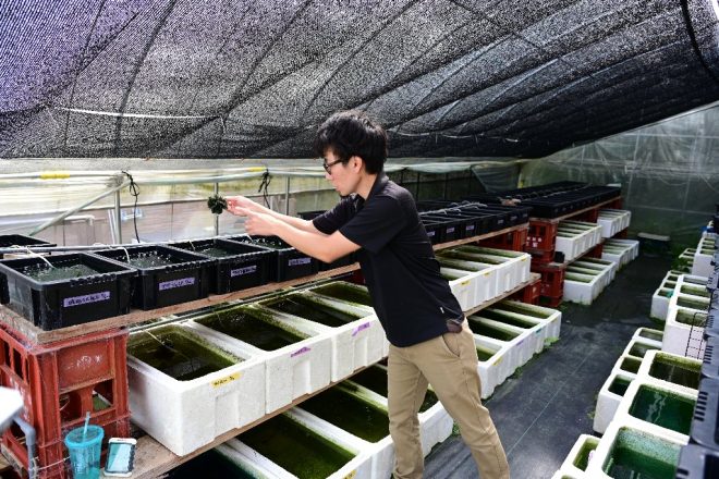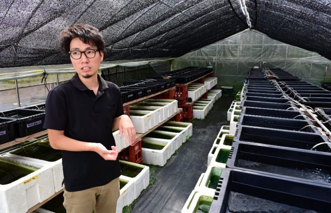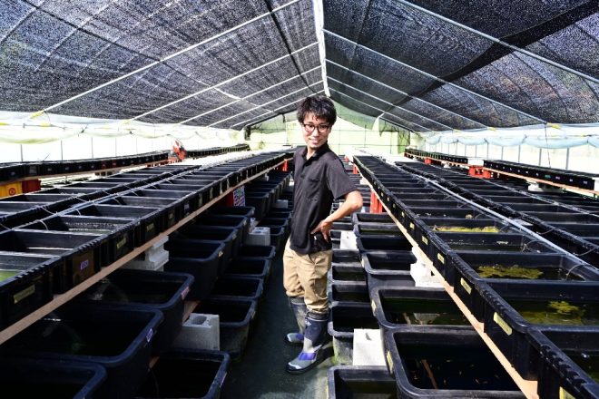 「こんにちは!」。元気のいい男性が声をかけてきたと思ったら、野口さんのスタッフでした。大阪市福島区出身の石田友樹さん、すっかり周りの風景に溶け込んでいます。「メダカを増やすのがとても楽しいので、野口さんにスカウトしてもらいました(笑)」と、とっても幸せそう。