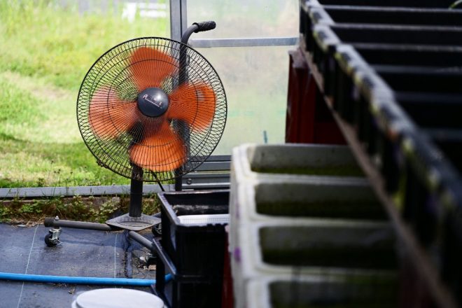 遮光も可能な二重構造。手動ハンドルをクルクル回せば簾代わり。これなら、とんでもなく室温が上昇することも抑えられます。メダカのために、やれることは何でもやる意気込みが伝わってきます。
