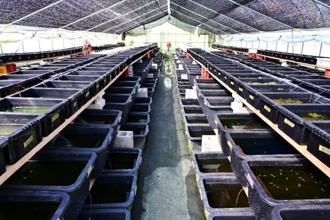 整然と並ぶ容器の数々。しかも3段設計。卵だけの容器、針子だけの容器、親だけの容器、そして販売用と、それぞれのカテゴリーに分類され作業もしやすくなっています。