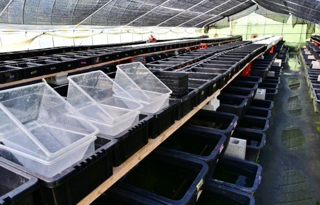 ビニールハウスの利点は何といっても、繁殖期間が長いという点にあります。「一般的な屋外だと5月から9月くらいまでですが、ビニールハウスだと産卵期が長く2月から11月ごろまで可能です。しかも温度管理も自在にできて、雨の日でも作業ができる点も大きなメリットです」。ビニールハウス内の容器数はざっと700以上。「どちらかというと、第1ビニールハウスでは高額品種を、ここでは比較的安価な品種をメインに繁殖しています」。