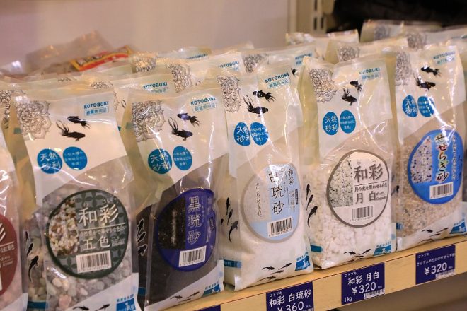 和テイストの底砂といえば、和彩シリーズ。発売以来すっかり認知度も定着した感がありますが、メダカだけでなく金魚愛好家にも好まれるアイテムのひとつです。「パッケージのデザインがおしゃれなので、店頭でもよく目立ちました」。ショップでは常時全6種類をフルラインナップ。中でも一番の人気は、真っ白な石「月白」。まるで月の光を思わせる幻想的なカラー「オールマイティに使えるという用途の広さだけでなく、白という日本人好みの色も人気の要因かも知れません」。