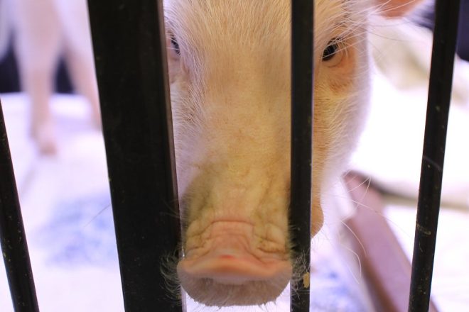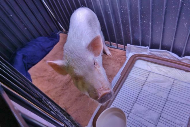 離れたところからでもわかるくらいずっとシッポを振っていたので、てっきりワンちゃんかと思って近寄ってみたら、ブタのポットベリー。毛並みがとってもきれいで本当に可愛すぎました。今ではすっかりショップの人気者です。まさに看板豚。