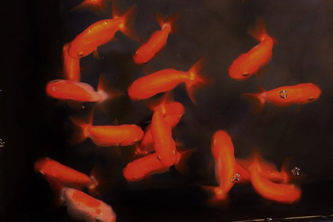アクアのコーナーのプラ舟には、優雅で美しい宇野らんちゅうが。まさに上見ならでは。最近は金魚にも注目し、選びに選んだ良質のものだけをブリーダーさんから仕入れて販売しています。