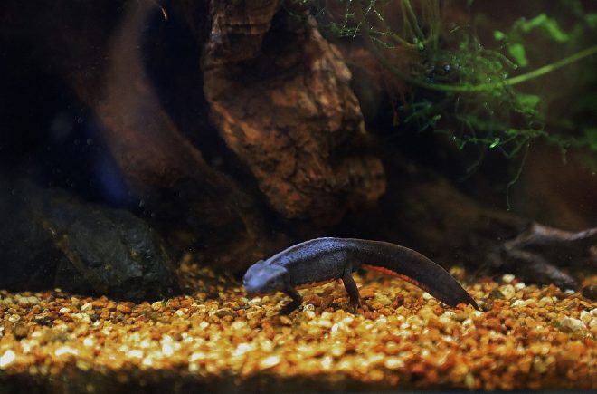 目を凝らしてよくみると、メインはオキナワシリケンイモリ。その名の通り沖縄地方に分布し、水のきれいな池や水田などに棲んでいます。