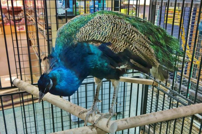 この子もいわば看板鳥。インドクジャク。とにかく色がきれい。十分羽根を広げられるラージサイズのケージにいて、優雅な姿をパフォーマンスしてくれていました。