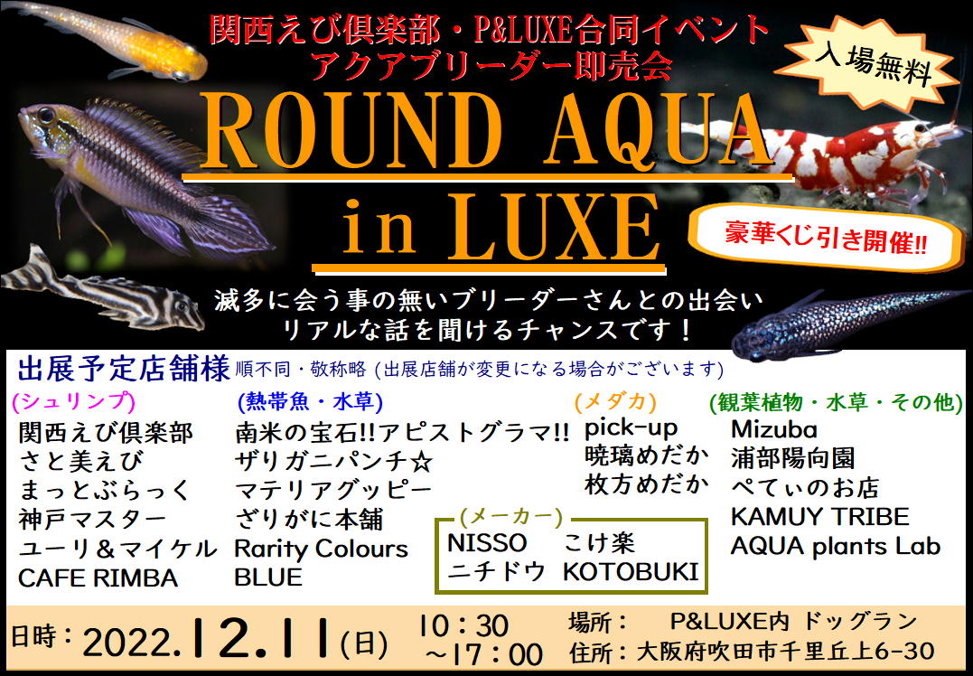 そんな努力が実を結びつつある結果として、今月11日(日)に開催される同ショップ初のアクアイベント「ROUND AQUA in LUXE」に注目。それぞれの生体に特化したブリーダーさんが出品する展示即売会です。熱帯魚はもちろん、メダカ、シュリンプ、観葉植物、水草などなど20の出品者が決定。このほか、KOTOBUKIを始めとするアクア関連メーカー4社も出品予定です。なお今後は、6月と12月の年2回開催することが決まっています。
