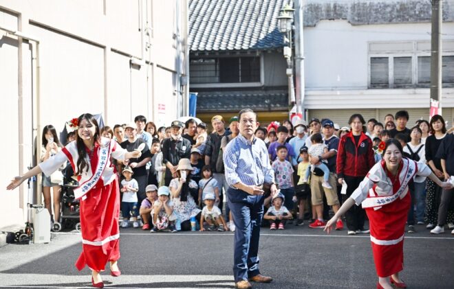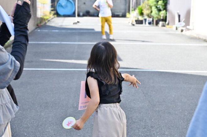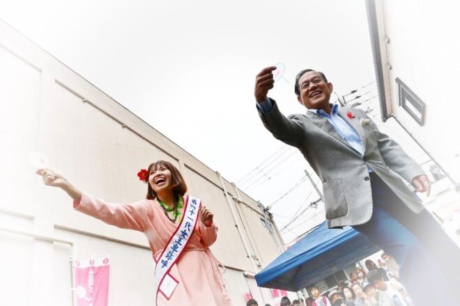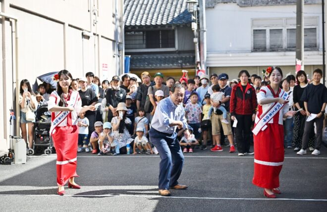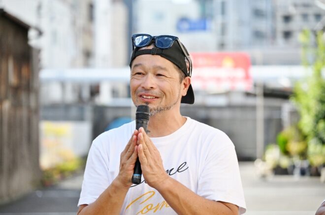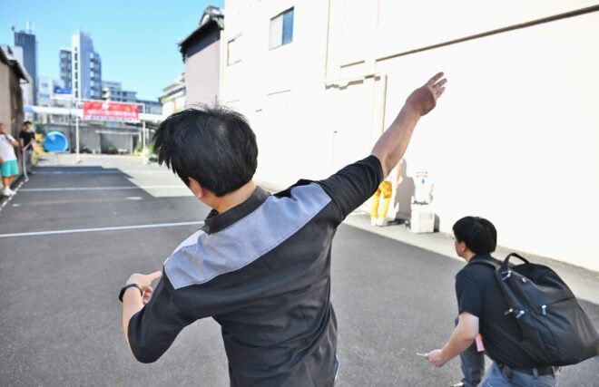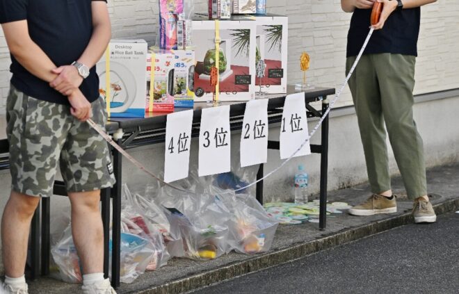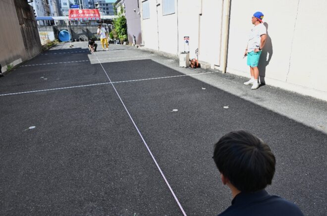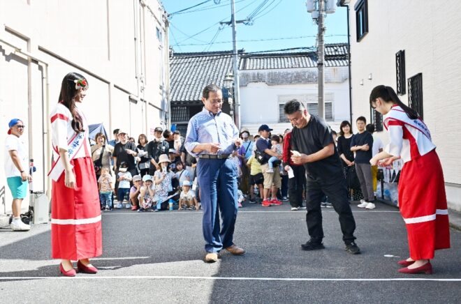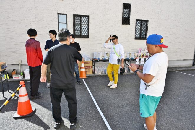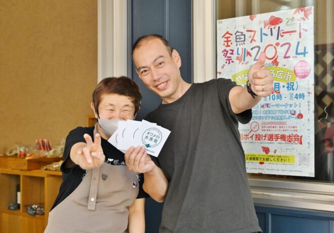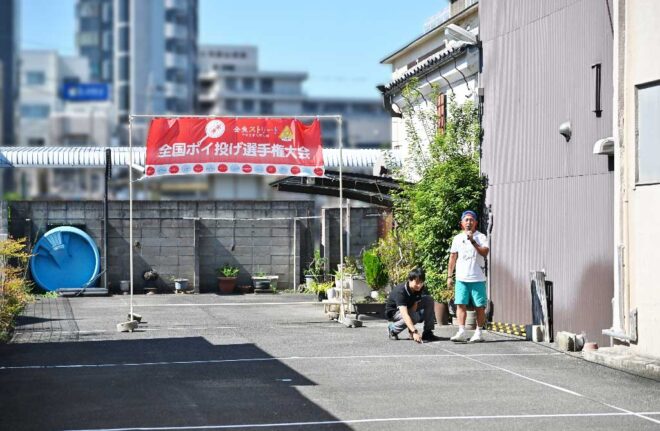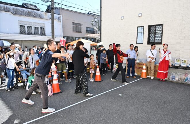 ちなみにこちらの特設会場は、商店街の理事を務めつつポイ投げ大会の実行委員長でもあり、そしてポイ投げ大会の発案者でもある弓場裕秀(写真右)さんのお店・ユミバ鳳凰堂専用の駐車場です。それにしても大きい駐車場で、軽く10台は停められそう。弓場さん、この日のために駐車場を開放していただきありがとうございました。みなさん、仏壇仏具のご用命なら信頼と実績のユミバ鳳凰堂におまかせください。