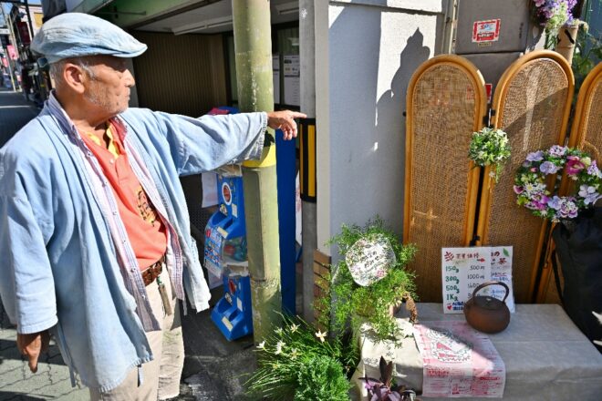 お寺を後にして、最初に出会ったのが乾 紘一さん。独特の雰囲気がある乾さん、最初はお寺の住職かと思いました。全身デニムの装いでなかなかお洒落です。朝の散歩と新聞を読むのが日課で、木製のキーホルダーの製作者でもありました。