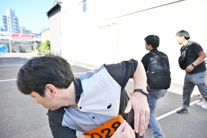 かくして競技スタート!いち早く受付に並んだ3人が同時にポイッ!