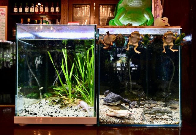 続いてカウンターの水槽を拝見。左の水槽にはウーパールーパーが2匹、右の水槽にはアフリカツメガエルが7匹。