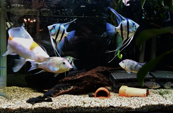 上段の60㎝には、ダンタムエンゼルをメインに、お掃除屋さんのゲオファーガススタインダックネリー、そして、見えづらいですがブッシープレコもわさわさいます。