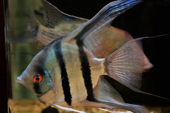 金魚がまだいなかったころ、この水槽ではエンゼルフィッシュ同士の仁義なき戦いが勃発。もともと気性の荒いエンゼルで難儀していたところ、「金魚と同居することになって、なぜか抗争がピタリと収まったんです」。同居するほかの魚にちょっかいを出されることの多い金魚だそうですが、「我関せずで堂々としているんです(笑)」。おかげで内紛は収まり争い合う魚もなく、一転平和になったそうです。金魚は平和の象徴とよくいわれますが、まさにその通りになりました。