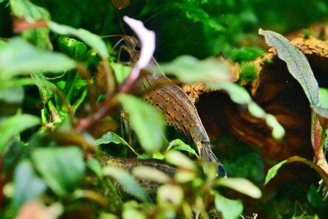 レッドビーやレッドチェリー、ルリーシュリンプなどのエビも混泳。「ちょっと色々と増えすぎてしまって。これからどうするか、考え中です」。
