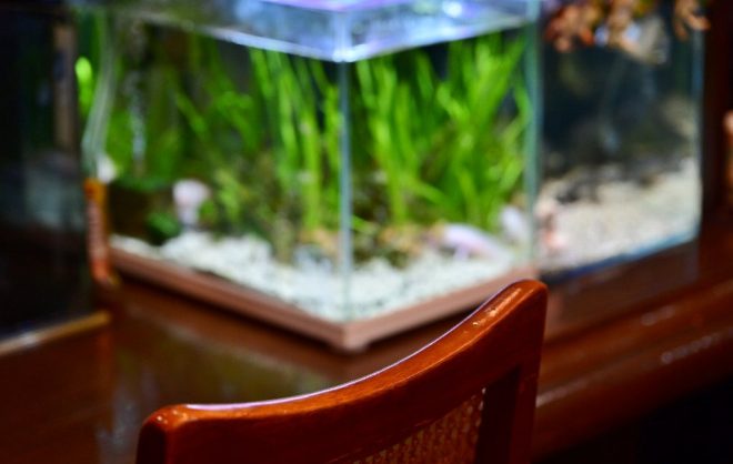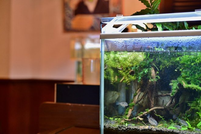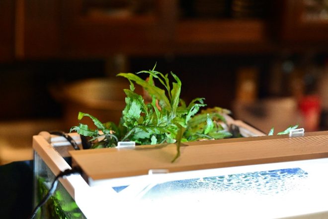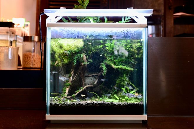「水槽はオープン当初から置いているのですが、隠れアクアユーザーが多かったのには驚きました。ご近所でアクアをやっている人がそんなにたくさんいたのか、という感じでびっくりしました。みなさんここへこられて、カミングアウト状態です(笑)」。