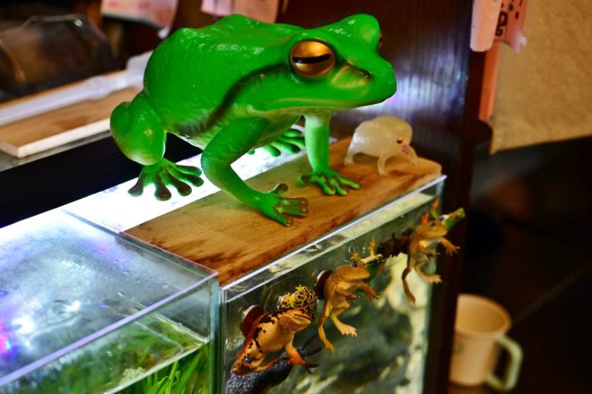 お客さんからも人気で、フィギュアや置物などカエルグッズも急増中。オスとメスの見分けかたなど、たまたまカエルを飼育中の近所の鰻屋さんとの交流も図れたそうです。