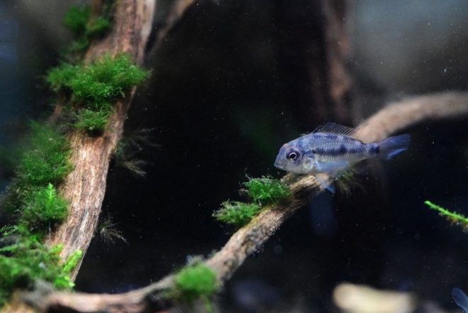 こちらの水槽には、ゲオファーガスの赤ちゃん。さっきもいたゲオファーガスと、水中には食虫植物のタヌキモを投入。