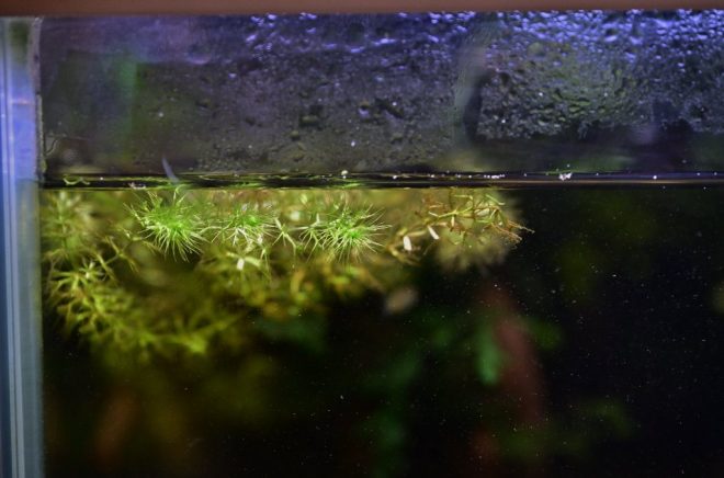 よく見ると、ボルビディスの水上葉がきれいに出ています。難しいんですよね、水上葉にまで成長させるのが。小さな水槽ですが、良平さんの世界観がいっぱい詰まっています。