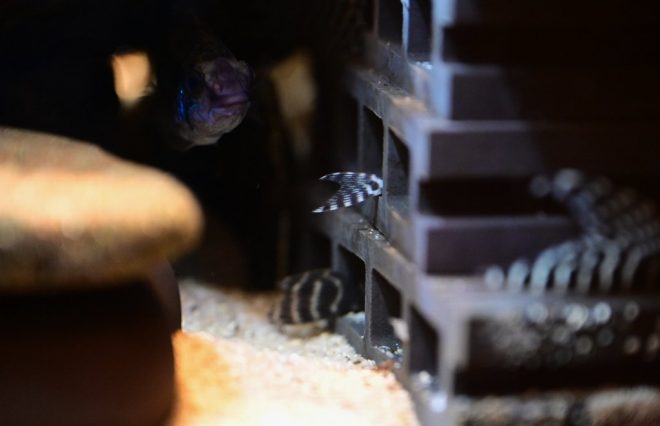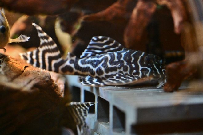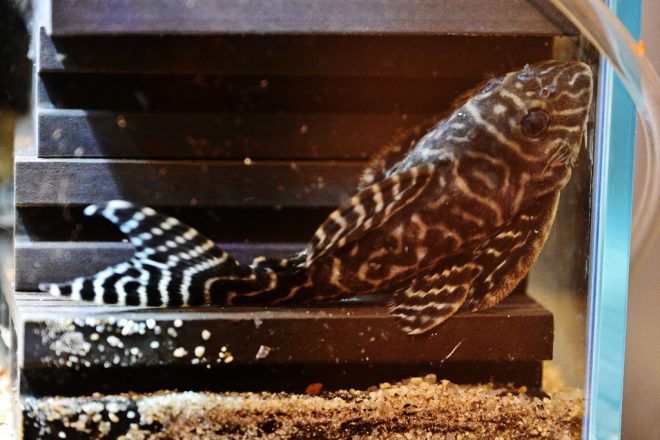 メインはキングロイヤルペコルティア。いわゆるキンペコ。そして、インペと呼ばれるインペリアルゼブラプレコも。店名にしたくらいプレコが好きな理由は?「やっぱりあのゼブラ模様ですかね。コントラストがきれいで、特に白い部分が多い個体はすごく高く評価されていますから」。