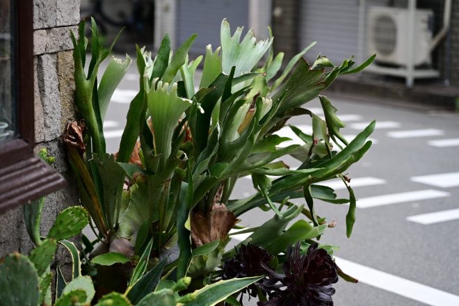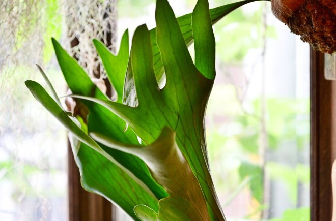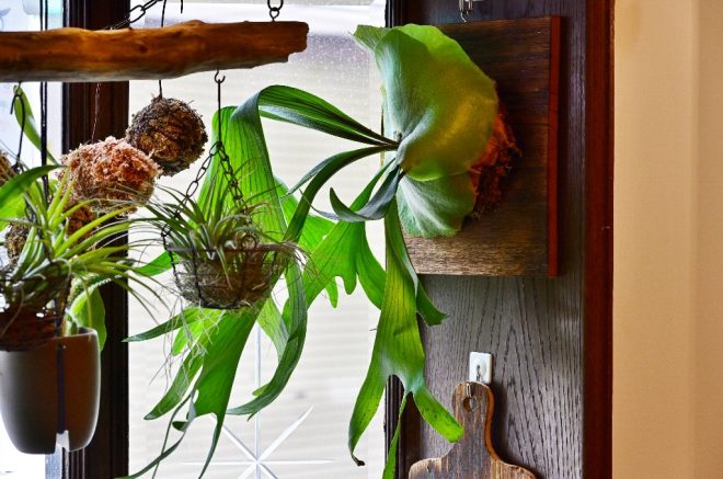 これってさっき玄関先で見たのと同じ?「そうです、ビカクシダです。貯水葉に水を溜めて育つ植物で、ダイナミックな葉のつくりが好きなんです」。