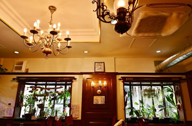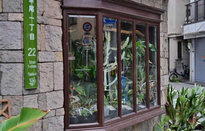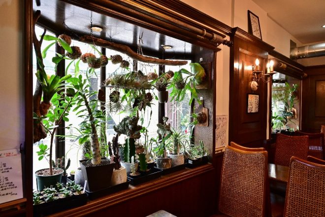 お店には出窓があります。しかも3つも。さらに出窓の向こうに見えるのは密集しすぎる植物たち。なんとまあ。え、プレコじゃなかったの(笑)?「はい、植物も好きで(笑)。開店前は出窓のある物件を探してたんです。これにはこだわりました」。