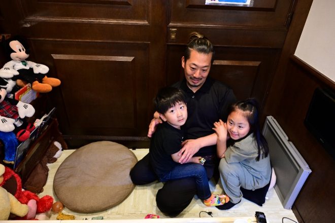 キッズスペースもある、ぷれこ。朝から晩までよく働く良平さんの支えは、2人の子どもたち。天使音(あまね)ちゃん(右)と3歳になる咲良(さくら)君(左)がいるから頑張れるのでしょう。