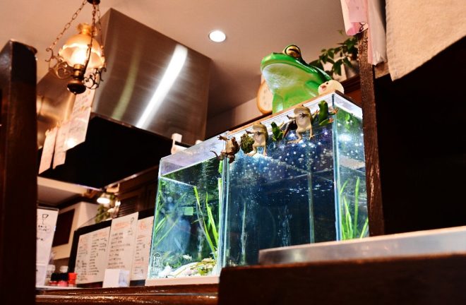 「ウーパールーパーの好きな女性のお客さんがおられて、いつもすぐ横のカウンターに座っておられます。見え方によっては、カエルと混泳しているようにもみえるとかで、ここが指定席になりました」。きっとウーパールーパーもわかっていることでしょう。