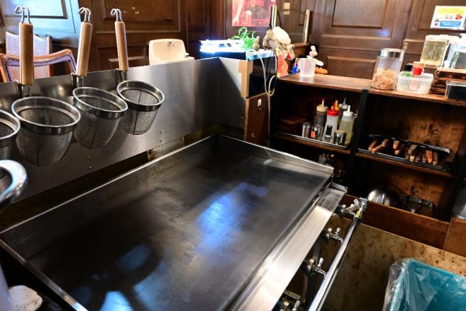 水槽のすぐ横には麺をゆでる器具が。良平さん自慢の焼きそばは、乾麺ではなく生麺を使っています。