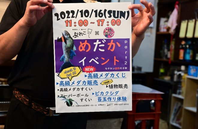 去年8月と10月、開店後知り合ったメダカ好きのアクア仲間の勧めもあって店内でイベントを実施。「どうせ人はこないだろうと思っていたら、何と100人近くもの来場者があってビックリしました。うれしかったです」。忙しかったでしょ?「メニューも普段通りに出して、しかもイベントもやったのでめちゃくちゃ忙しかったです」。