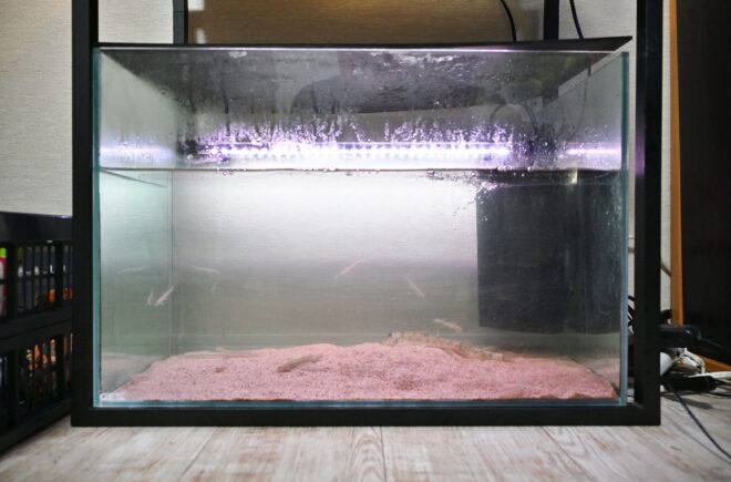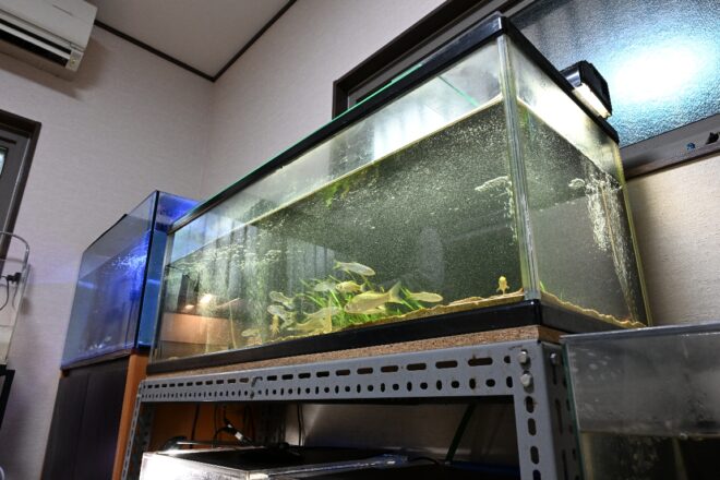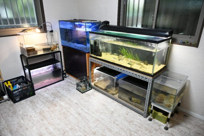 上の2本がこれまでの陸君の集大成ともいうべき淡水魚水槽。手前のナチュラルなライティングが施された水槽は120㎝、奥のブルーライトな水槽は90㎝。2本の水槽とも外部フィルターを使用していますが、ブルーライト水槽下の水槽台に2個とも格納。夏はフル稼働し、120㎝水槽に限ってはエアレーションを2本追加。管理が難しいといわれる川魚の環境を安定させています。