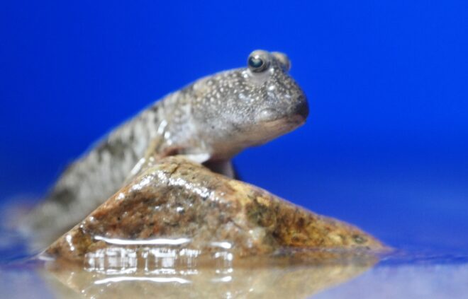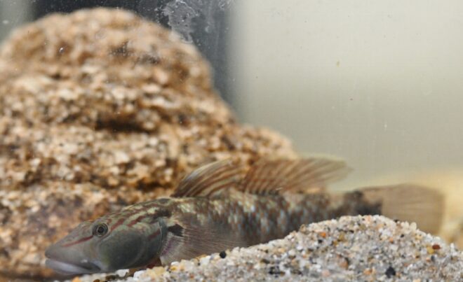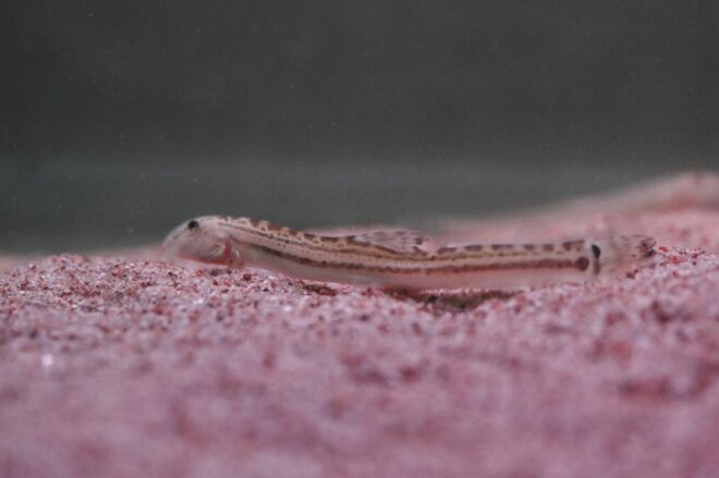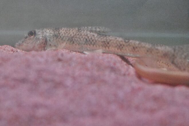 大半が和歌山で採取したノーマルのトビハゼですが、沖縄で採取したミナミトビハゼもほんの数匹います。撮影しようとチャレンジしましたが、「背びれがあるのですぐにわかるんですが、今は後ろのほうに行っちゃってる感じです」。