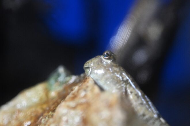 こちらはトビハゼ水槽。結構大きなサイズのトビハゼが複数います。この水槽だけは汽水域。ノーマルな海水と違って、塩加減が難しいとのこと。でしょうね、汽水域といっても水域によっては塩分濃度が違いますから。そして微妙な砂と水とのバランス。干潟を再現しなくちゃいけませんから。