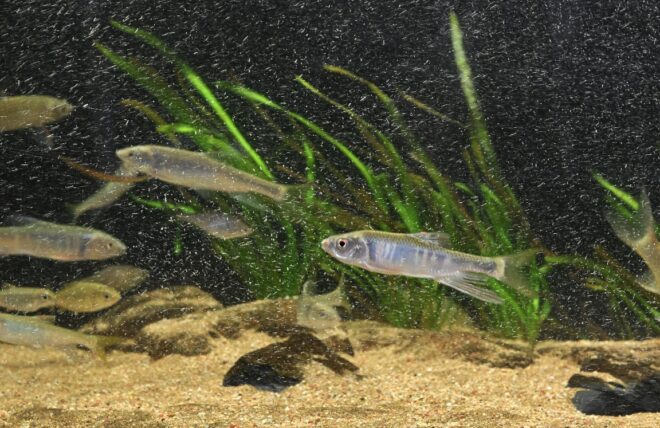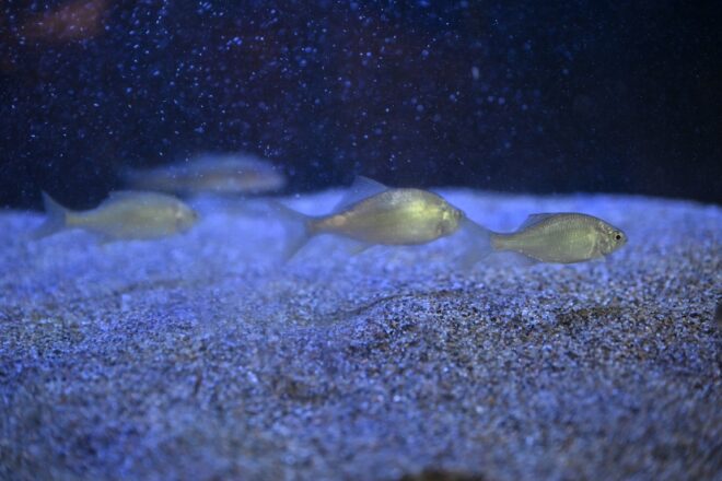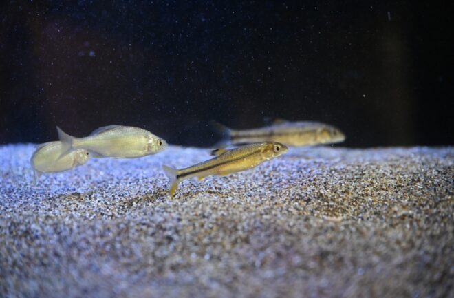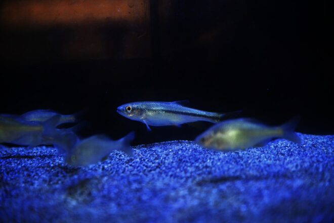 エキゾチックなブルーが印象的な90㎝水槽には、シロヒレタビラ、アブラボテ、ヤリタナゴ、ビワヒガイ、ヌマムツ、ニホンウナギなどが約30匹。