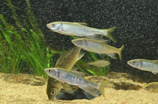 こちらの水槽には、約20匹の川魚がイン。撮るのムズっ!元気よすぎっ!いや~、マジで川の中をライブで見ているよう。エアレーションによって無数に広がる気泡に誘われるように、オイカワ、モツゴ、ウグイ、ニゴロブナ、アブラボテ、ヤリタナゴなどが素早く元気よく泳いでいます。うん、横見バンザイ!
