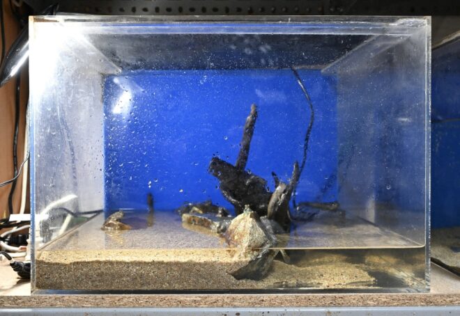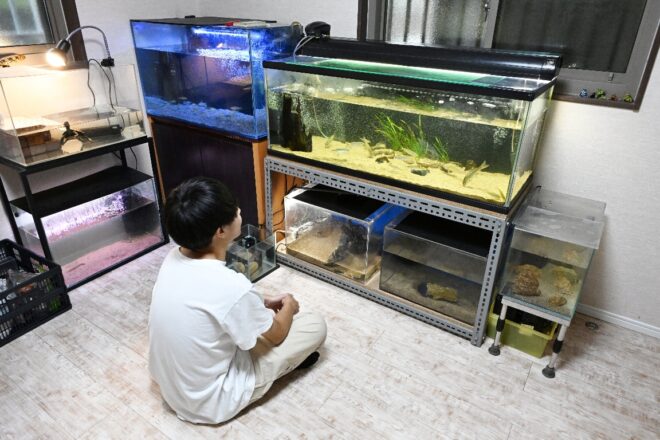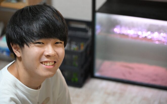 ややピンクがかったこの水槽にいるのは?「ドジョウです」。ああ、そういえば以前会った時に、全種類のドジョウを揃えたいって言ってたのは陸君やったっけ?「はい、そうです!」。子どものころ、田んぼの用水路や川でよくドジョウを観察することも多かった陸君。だからでしょうか、陸君にとってドジョウはとても身近な存在のようです。