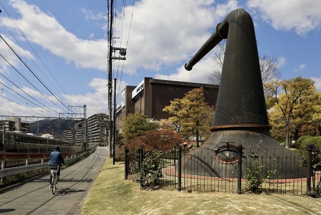 JR京都線・山崎駅の踏切近くにあるのは、かつてウイスキーの製造で使用されていた蒸溜釜。今やオブジェ化され、まちの象徴物ともなっています。