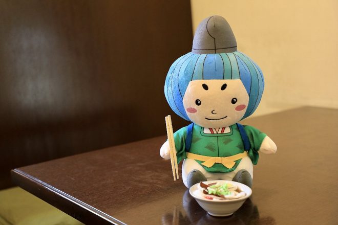 島本町のオフィシャルキャラクター「みづまろくん」とともに。ちなみに、現在も水道水の90パーセントに離宮の水が使われているそうです。最近は若いファミリー層が少しずつ増えてきたという島本町、水がこんなにおいしいと子どもたちも安心です。
